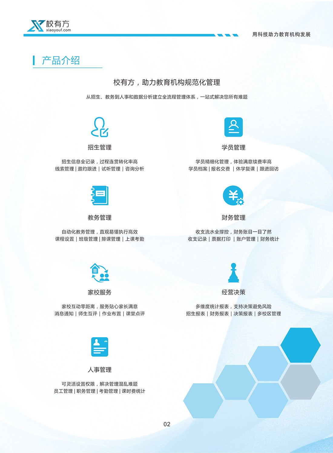 淮南方大网络技术有限公司成立于2016年,是一家创新型软件研发企业。公司旗下研发的校有方(www.xiaoyouf.com)教育机构运营管理系统,是涵盖教育机构运营管理的各个关键节点,推出至今,帮助众多教育机构完成招生、学员管理、 教学管理、人事管理、财务管理、统计分析等全方位的管理,给用户带来工作效率的提升,深受教育机构管理人员的好评。